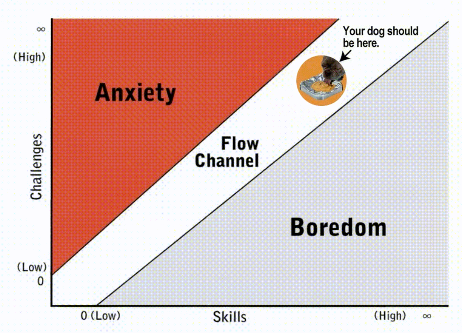 By providing a specific level of challenge—not too easy (boredom) and not too hard (anxiety)—we keep your dog with busy tongue in the Flow Channel".